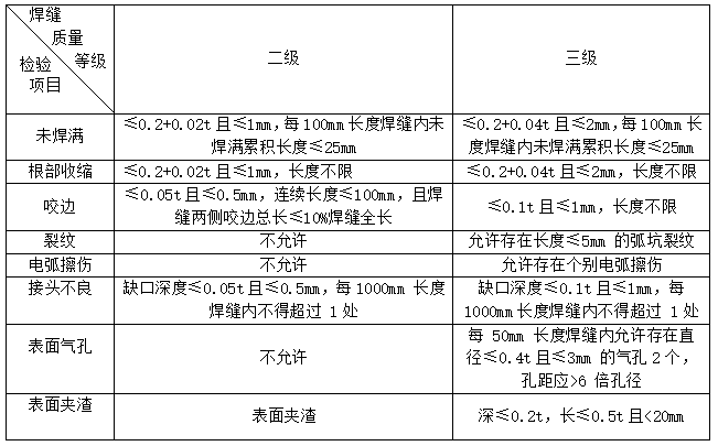 二级焊缝:不得存在表面气孔、夹渣、裂纹、电弧擦伤等缺陷。未焊满、根部收缩、咬边和接头不良等缺陷应符合《建筑钢结构焊接技术规程》(JGJ81-2002)“表7.2.3 焊缝外观质量允许偏差”要求。