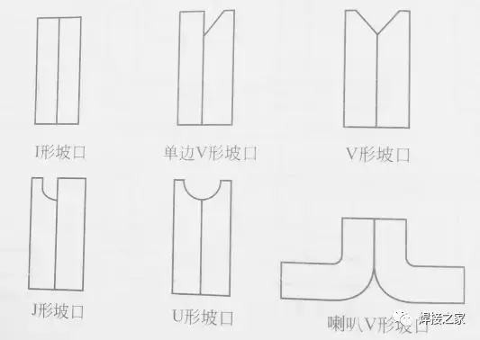 T形接头常见的坡口有I形坡口、单边V形坡口、双单边V形坡口、J形坡口和喇叭单边V形坡口等几种形式,见图: