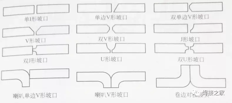 对接接头的坡口形式有单I形、单边V形、双单边V形(也称K形)、V形、双V形(也称X形)、J形、双」形、U形、双U型、喇叭单边V型、喇叭V型、卷边对接等,见图: