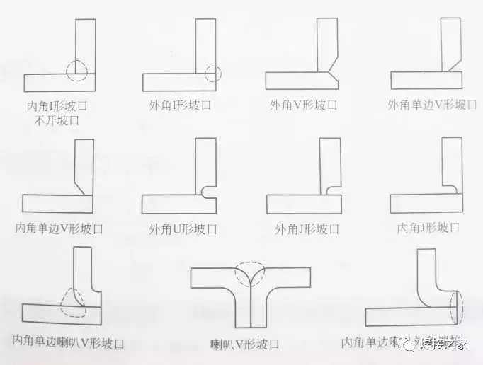 角接接头的常用坡口形式有I形坡口、外角V形坡口、外角单边V形坡口、内角单边V形坡口、外角U形坡口、外角J形坡口、内角J形坡口、内角单边喇叭V形坡口、喇叭V形坡口、内角单边喇叭外角端接等几种形式,见图: