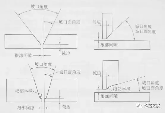 表征坡口几何形状及尺寸的参数有哪些?表征坡口几何形状及尺寸参数有根部间隙、钝边、坡口角度、坡口面角度、U形根部半径等,如图所示。