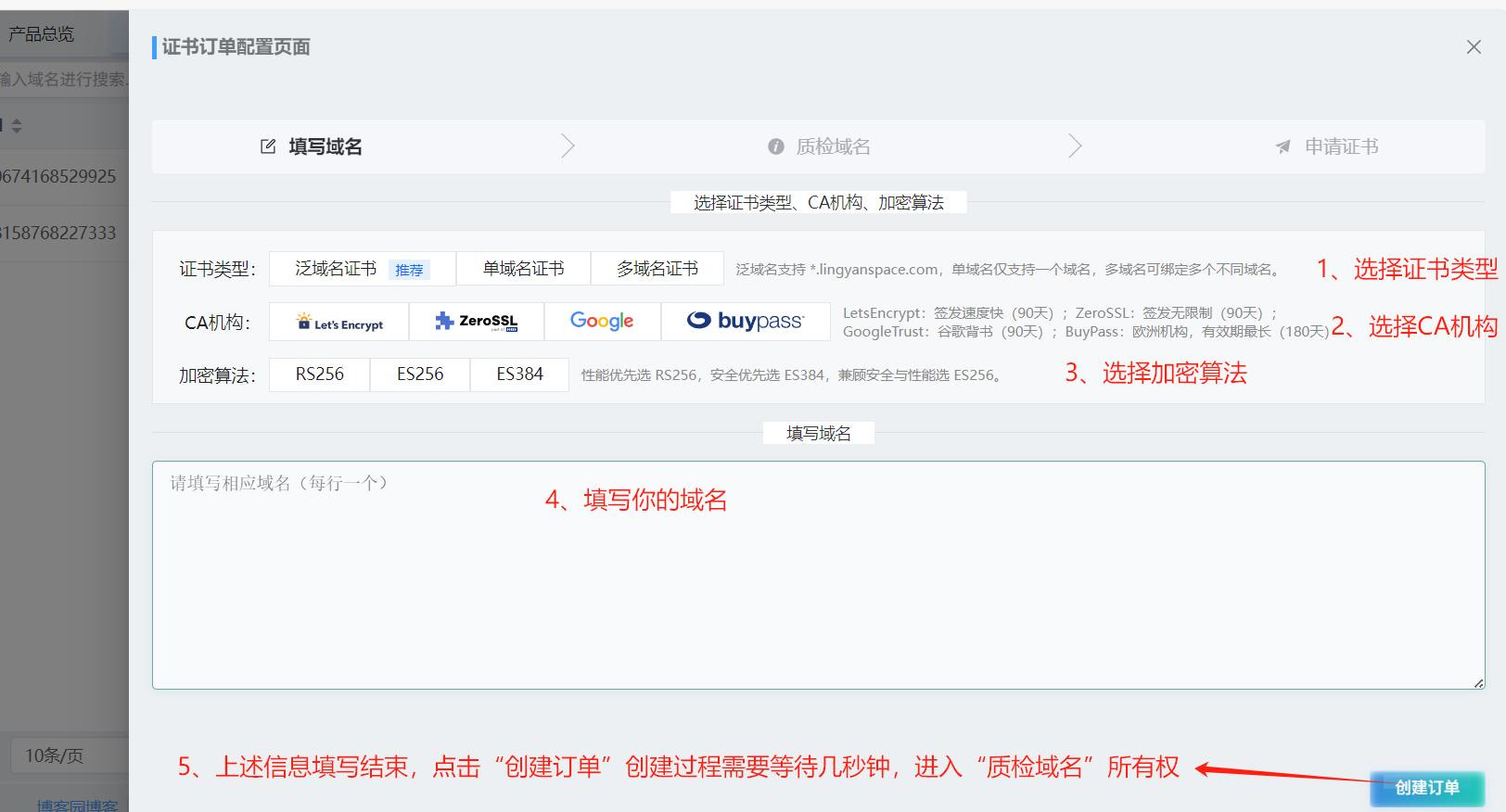- 选择证书类型、域名、算法等核心参数